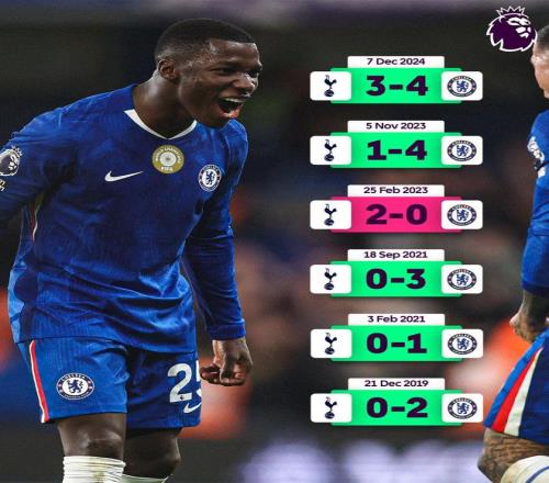 据数据统计,切尔西在过去14次与热刺的英超交锋中赢下了11场,并在热刺近六次主场中五次取胜。