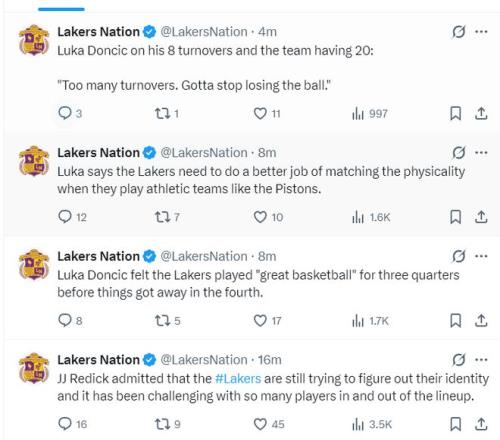 雷迪克认为失误、对手的内线得分、快攻杀死了湖人队。东契奇谈到自己的八次失误表态,失误的确太多了,我该确保自己的传球不要出界,湖人打了三节好球可在第四节却崩盘了。