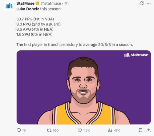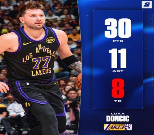 赛前数据媒体晒出东契奇本赛季场均33.7分联盟第一,8.3篮板后卫第二,8.6助攻联盟第四,1.6抢断联盟第六,他成为湖人队史首位30+8+8的球员。